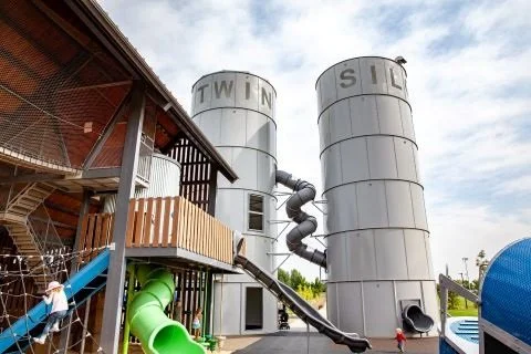 Area with plenty of family-friendly features. It has wide open grassy areas, a large playground with climbing elements and a zip line, bocce ball courts, a built-in ping pong table, a hammock garden, cornhole boards, a basketball court, picnic spots, and walking paths